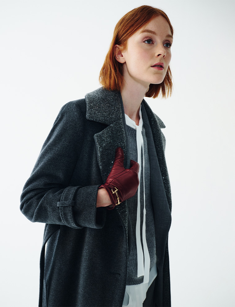 Warm shades like camel or neutrals like cream and grey are mixed with bold accessories — burgundy gloves, glossy red loafers or black pumps. The result? A sophisticated eye-catching twist.
