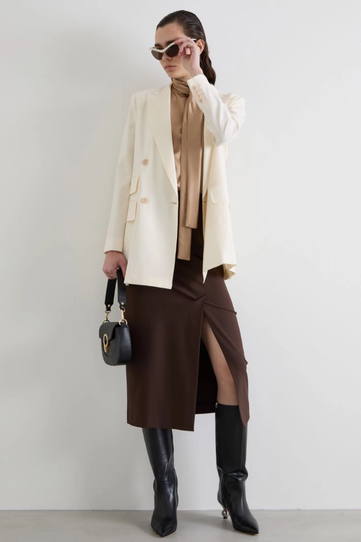 Straight-fit blazer in pure wool canvas, with topstitching, peak lapel collar, long sleeves with buttons, chest pocket and double-welt side pockets with flap. Side vents and double-breasted fastening with buttons. Lined.