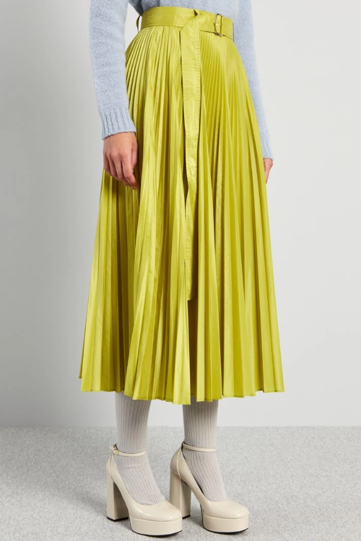 Long flared skirt in silk blend taffeta with pleated details. With belt and belt loops at the waist. Invisible zip fastening and hook on the side. Matching belt.