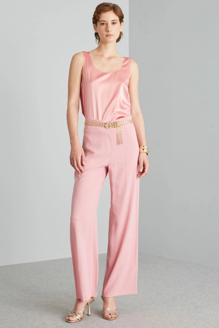 Palazzo trousers in stretch viscose blend envers satin, with waistband and invisible zip fastening on the side.