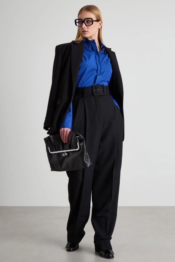 Wide-leg trousers in pure wool woven fabric finished with a satin band along the sides, pleats and belt loops at the waist, inset pockets at the front, welt pockets at the back and crease ironed lengthwise with turn-up at the bottom. Hidden fastening with zip, button and hooks. Belt with coordinated maxi buckle.