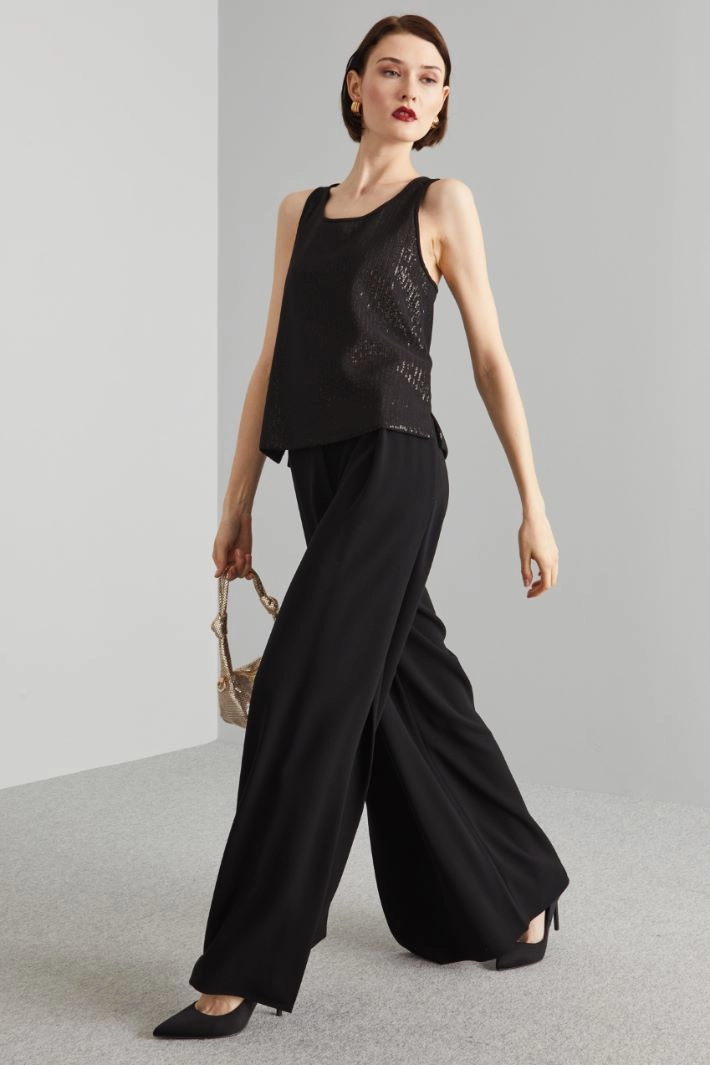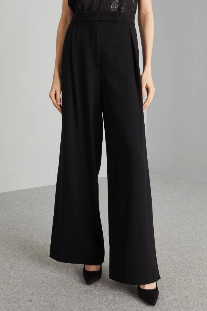 Wide-leg cady trousers with belt at the waist, slant pockets and deep slits at the hem. Hidden fastening with zip, button and hook.