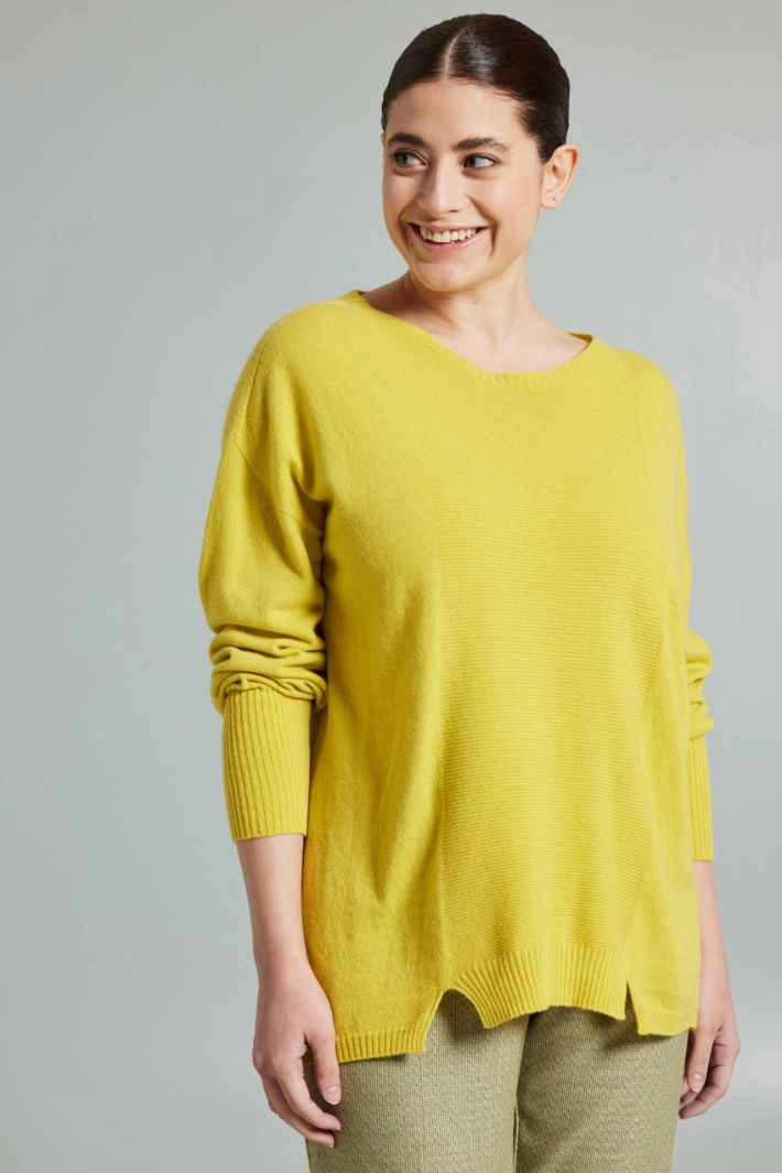 Regular-fit sweater in wool, viscose and cashmere blend yarn, with round neckline, long sleeves, horizontal ribbed pattern on the front and micro slits at the hem.