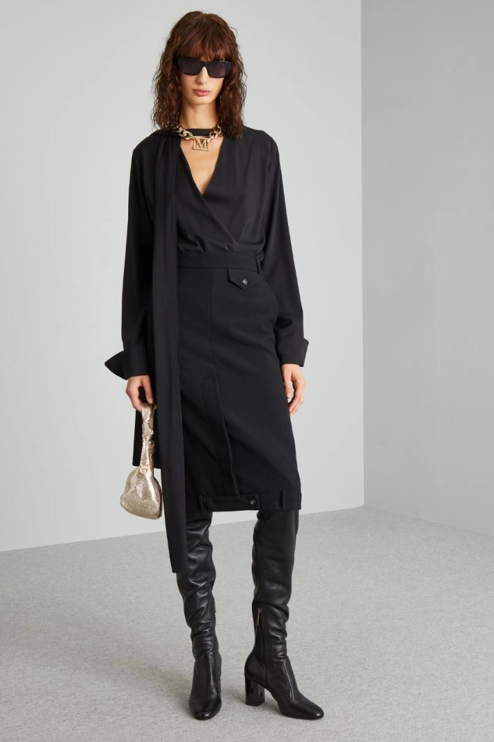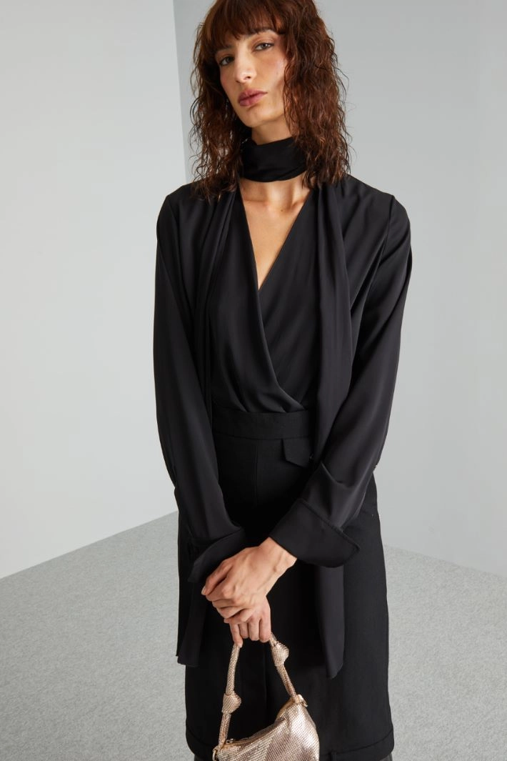 Fluid blouse in shiny stretch silk fabric, with crossed V-neck finished with scarf, long sleeves with turned-up cuffs and buttons, fastening with hooks.
