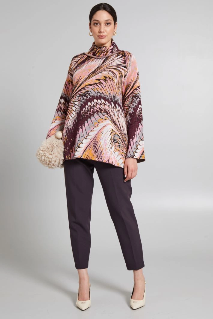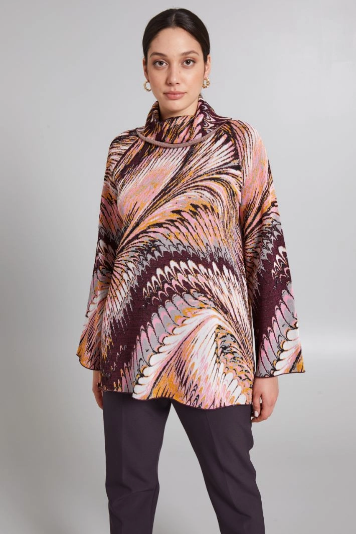 Flared-cut sweater in jacquard viscose blend yarn, with lamé fibre insert, high turned-up neck and long raglan sleeves.