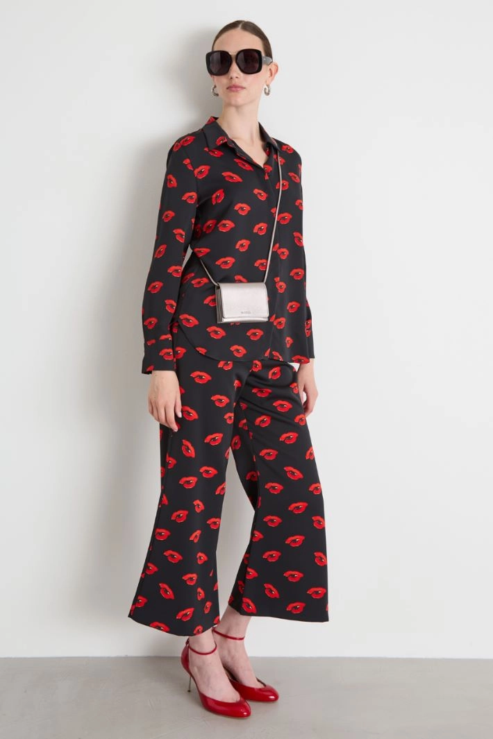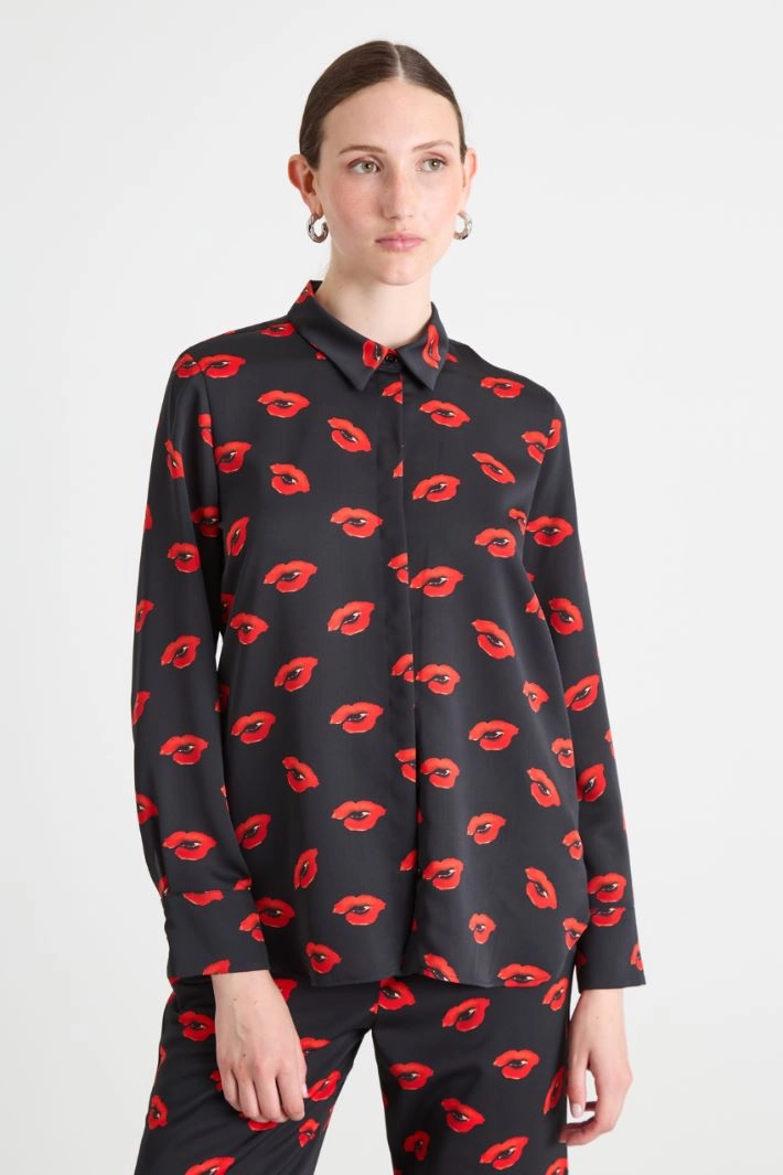 Straight-cut shirt in all-over printed envers satin, with classic collar, long sleeves with cuffs and buttons, and hidden button fastening.