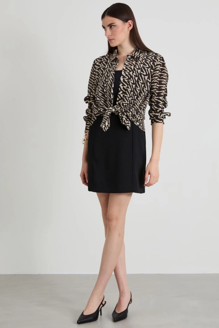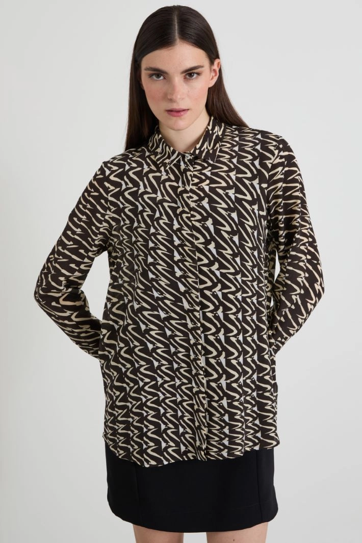 Straight-cut shirt in printed silk crepe, with a classic collar, long sleeves with cuffs, a pleat on the back and side slits at the bottom of the garment. Concealed button fastening.
