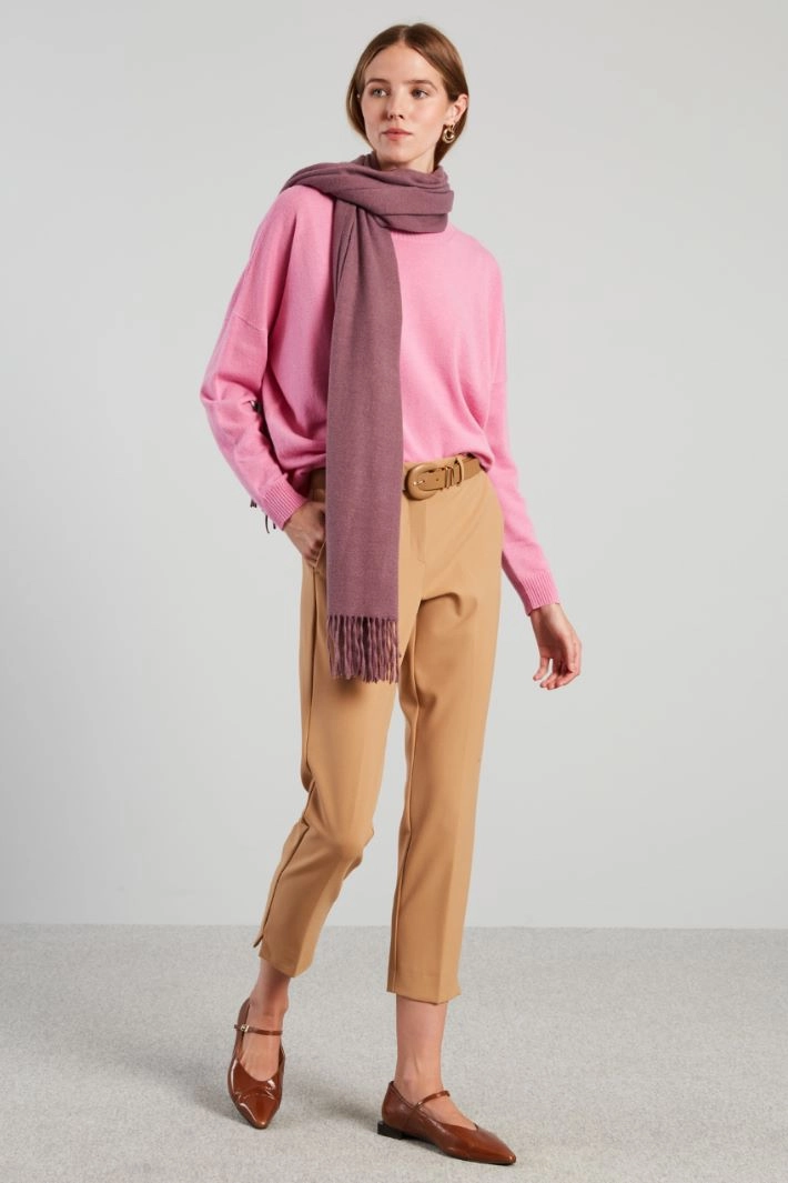 Cropped cigarette trousers in stretch viscose blend canvas, with belt loops at the waist and waistband, French pockets at the front and double welt pockets at the back, vents at the hem. Hidden fastening with zip, button and hook.