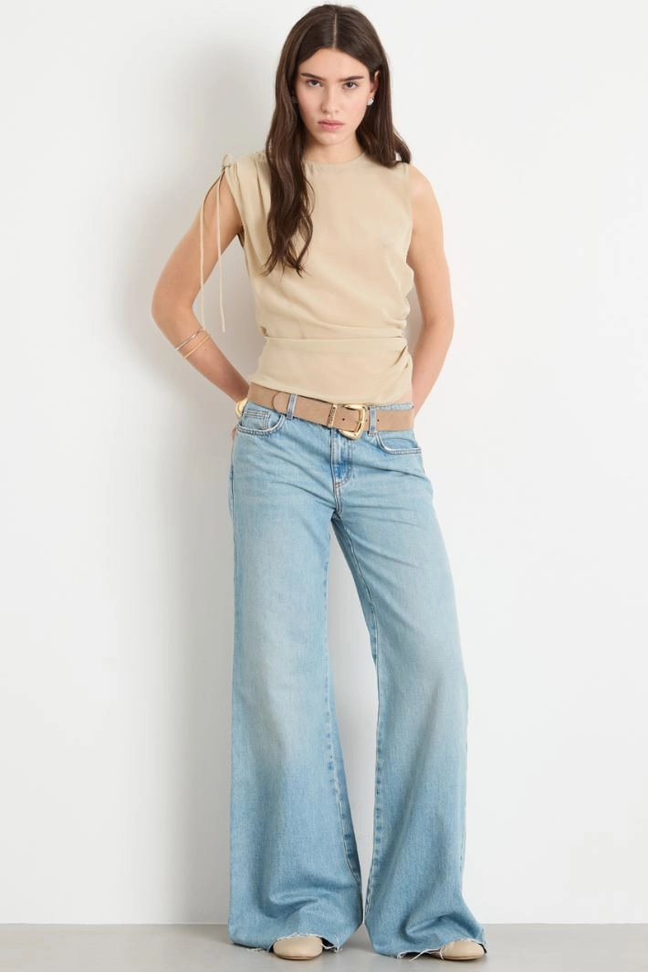 Flowing top crafted in pure silk, with a round neckline defined by drawstring detailing on the right shoulder and at the hem. Rear zip fastening.