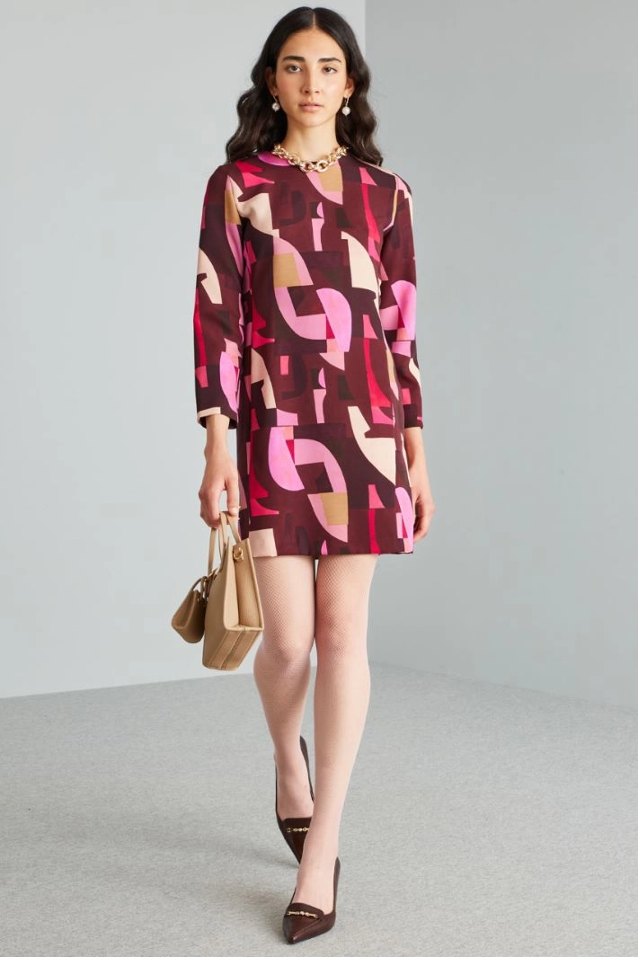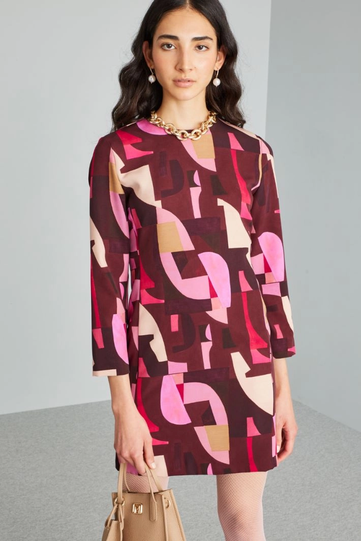 Short straight-fit cady dress with round neckline and long sleeves. Invisible zip fastening on the back. Lined.