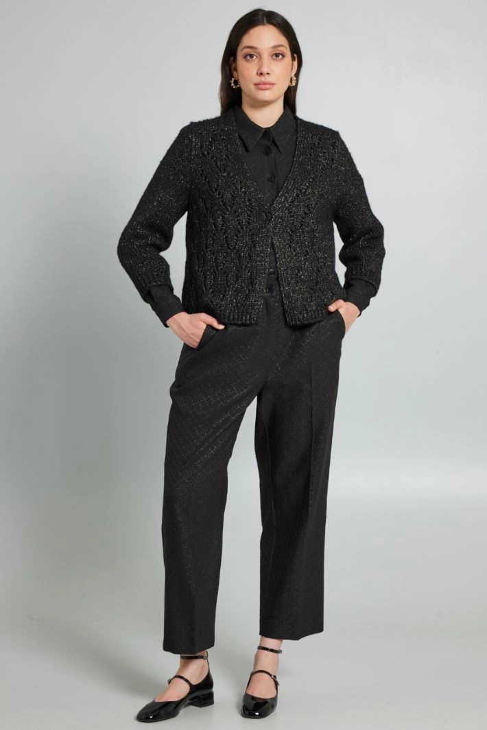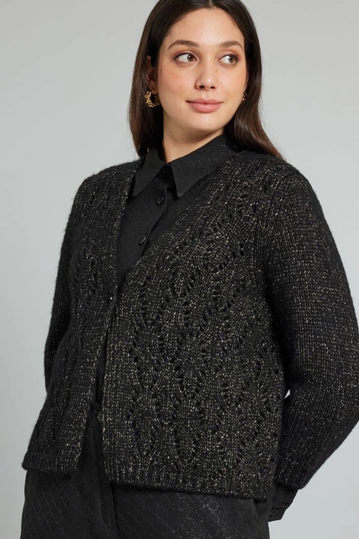 Regular-fit openwork cardigan in a wool and alpaca lamé blend, with V-neck, long sleeves and ribbed trim. Fastened with visible buttons.