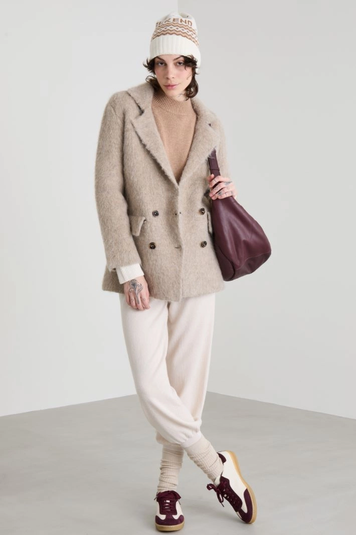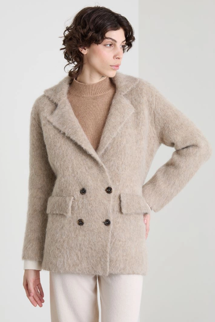 Straight-fit peacoat-style cardigan in wool and mohair blend with a fluffy effect, a lapel collar, long sleeves and side pockets with flaps. Double-breasted fastening with visible buttons.