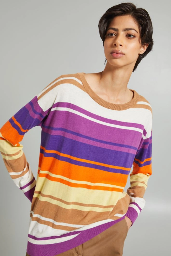 Loose-fit sweater in yarn-dyed cotton and cashmere yarn, with round neckline, long sleeves with dropped shoulders and ribbed trims.