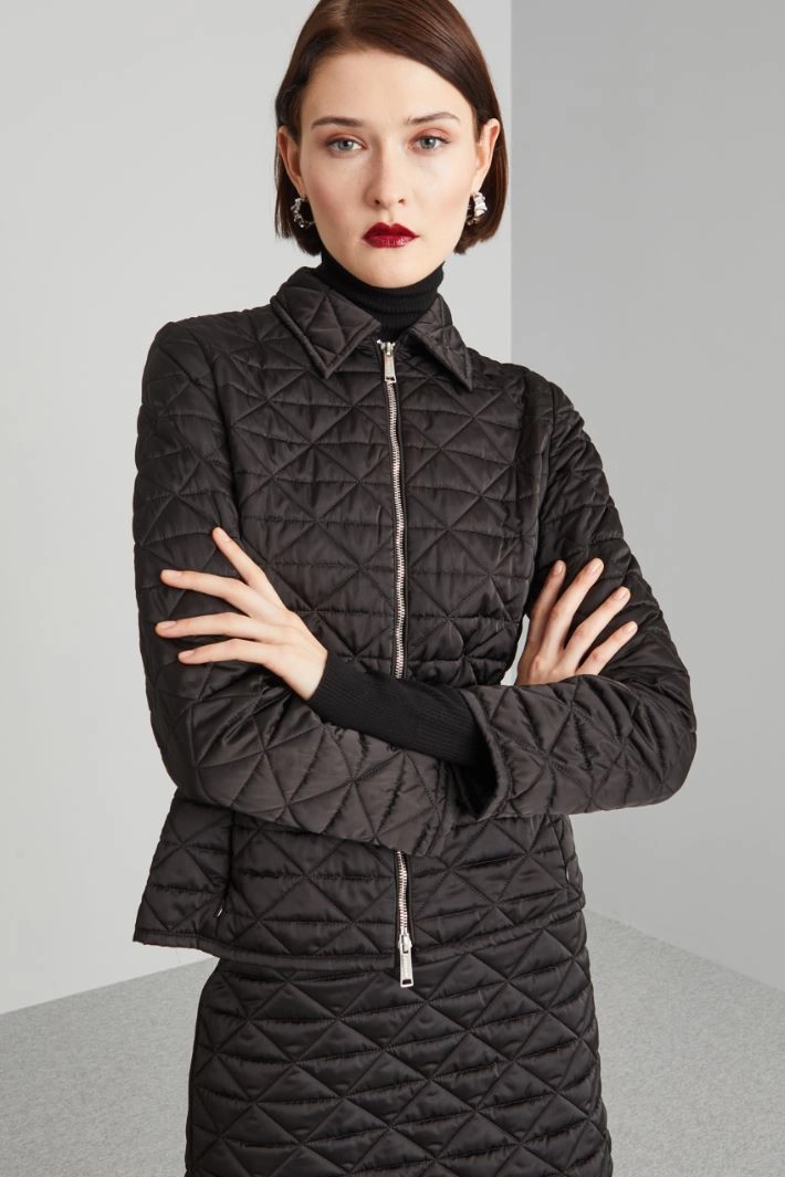 Lightweight short padded jacket with a slim fit in quilted technical satin, with shirt collar and long sleeves. Single-breasted zip fastening and matching elastic belt.