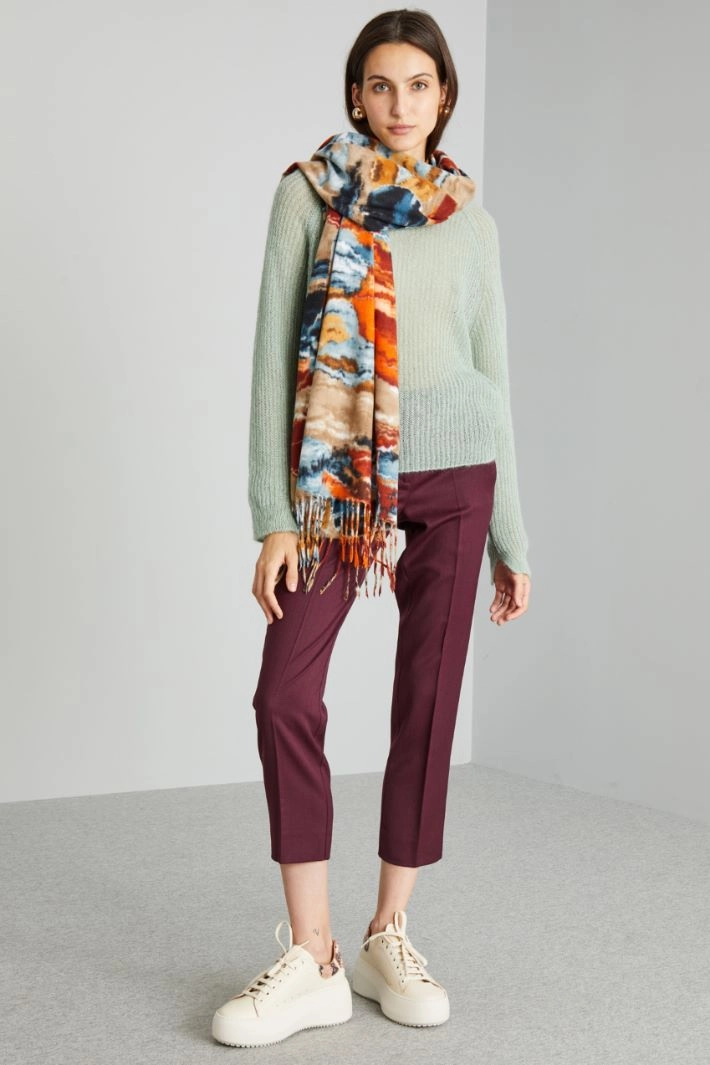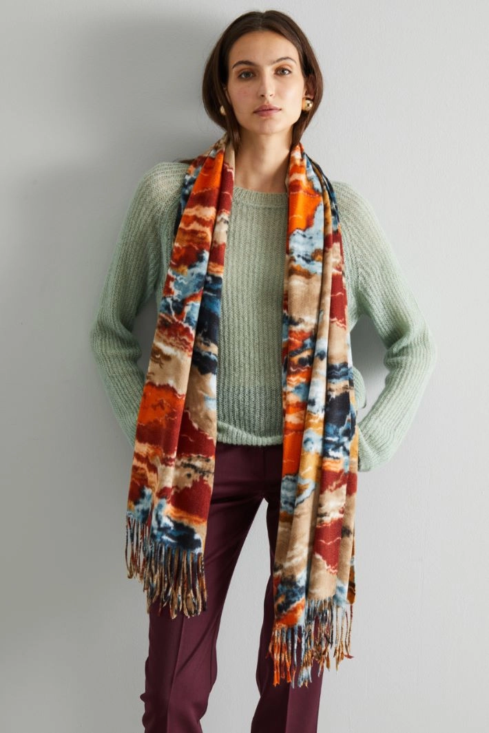 Scarf in light printed cloth, with fringe pattern at the bottom.