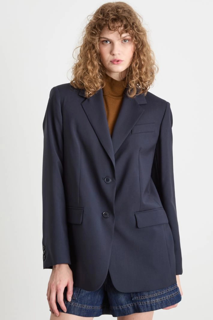 Straight-fit blazer in pure stretch wool canvas, with a lapel collar, chest pocket, long sleeves and flapped welt pockets. Central back vent. Lined. Single-breasted fastening with buttons.