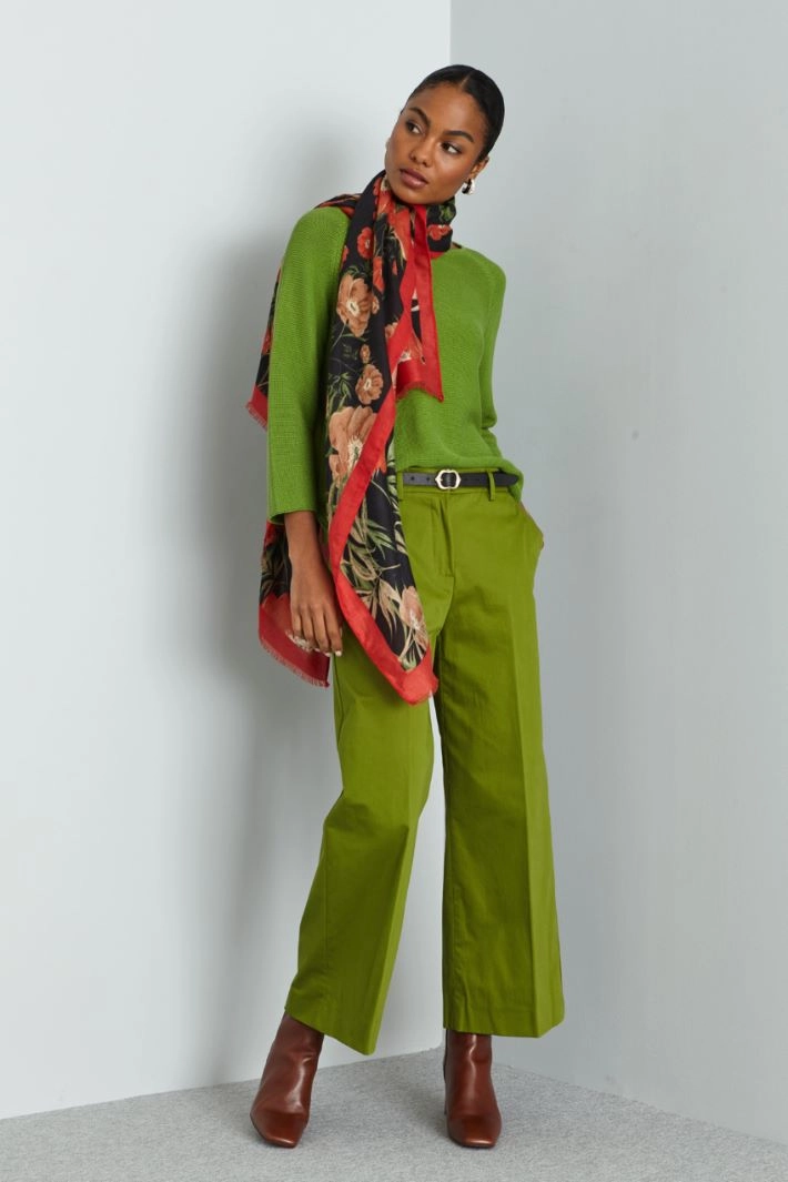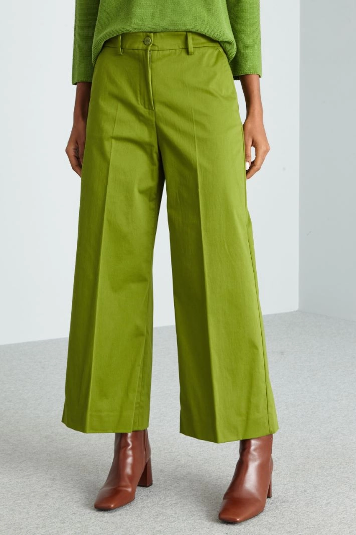 Cropped trousers with a straight cut in stretch cotton satin, with belt loops at the waist, side French and welt pockets with button on the back, pressed pleat along the length and fastening with a hidden zip and button.