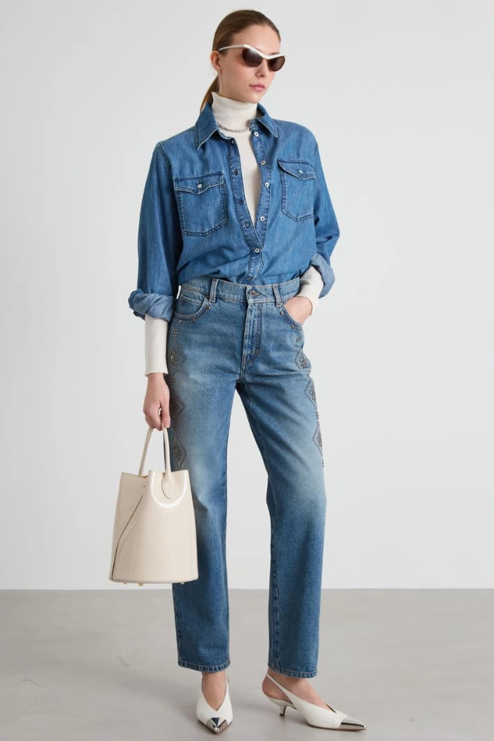 Straight-fit jeans in pure cotton denim, featuring an appliqué stud motif, belt loops, five pockets and fastening with a hidden zip and metal button.