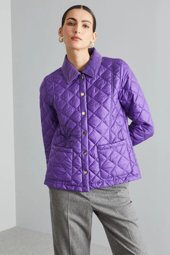 Padded shirt-style jacket in quilted technical satin, with classic fabric collar, long sleeves, side patch pockets and fastening with snap buttons on the front.