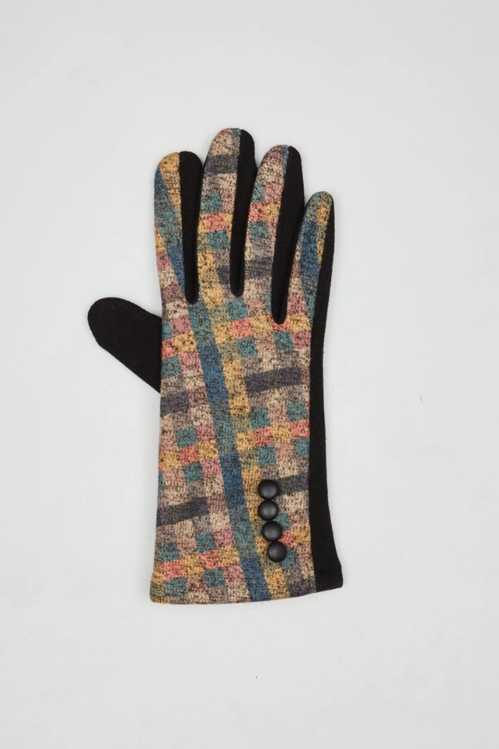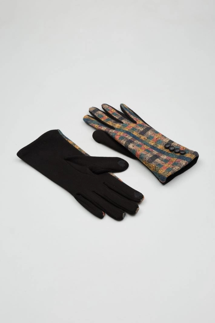 Gloves in stretch cotton blend jersey, with patterned insert and covered button pattern on the wrist. Plush interior.