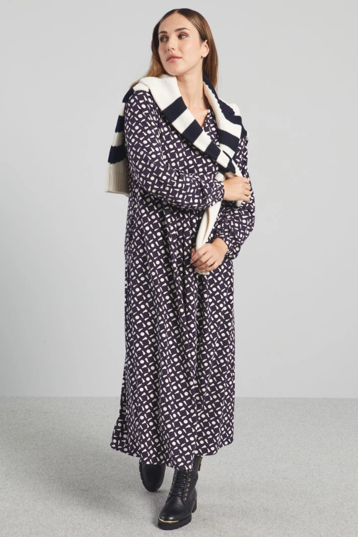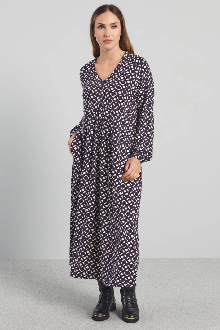 Long, loose-fitting dress in printed stretch viscose jersey, with V-neck, long sleeves with thin cuffs and button, pleats stitched at the waist and inset side pockets.