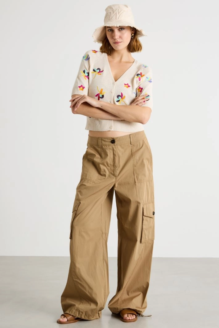 Straight-fit cargo trousers in cotton poplin, with belt loops, front and back patch pockets, buttoned flap pockets on the legs and elasticated drawstrings at the hem. Button and zip fastening.