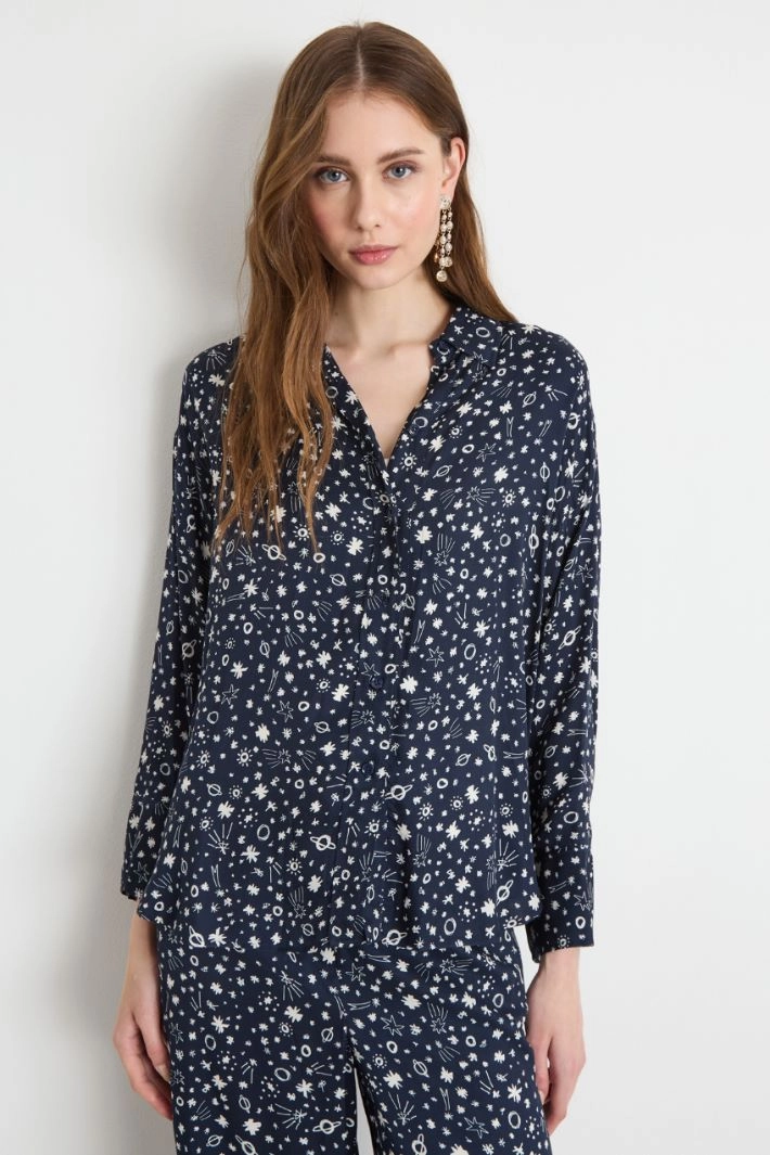 Flowing blouse crafted in printed viscose, featuring a pointed collar, long sleeves with wide cuffs, and a back yoke with a box pleat. Button fastening.