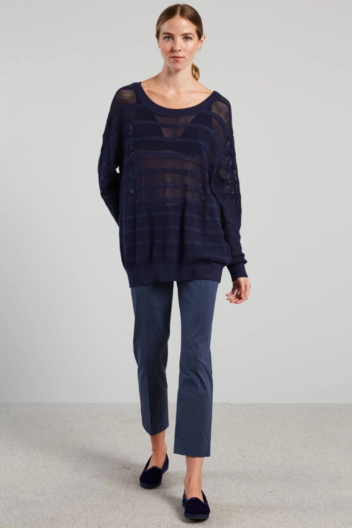 Long, loose-fit openwork sweater made from a viscose blend yarn, with a wide neckline, long dropped sleeves and ribbed trim.