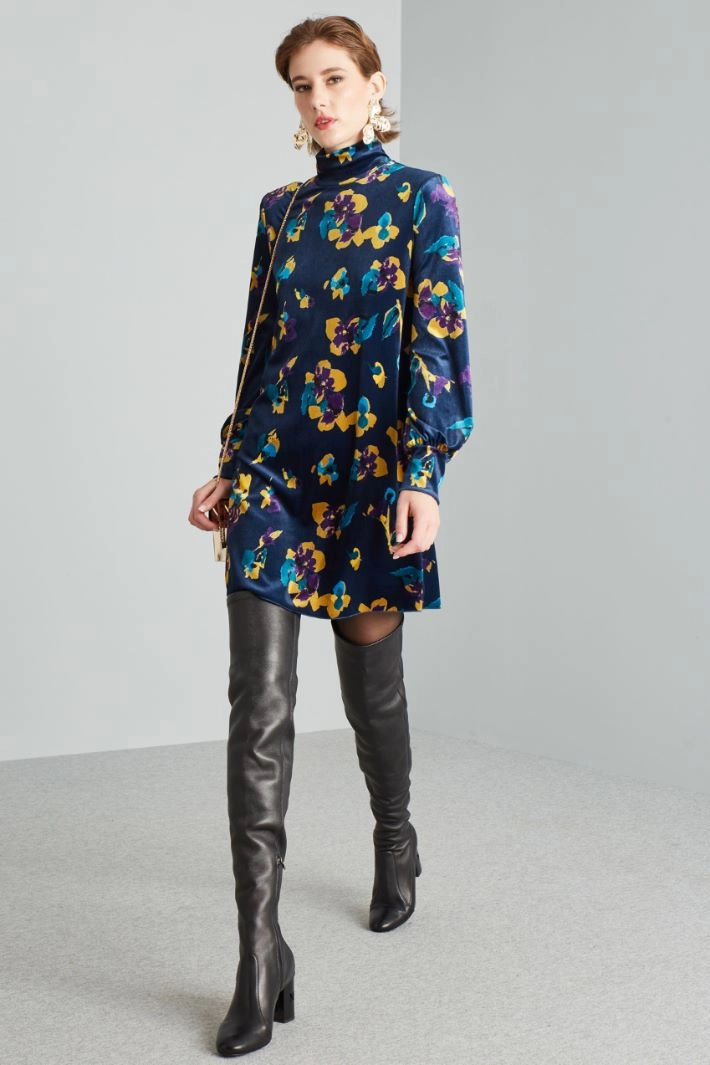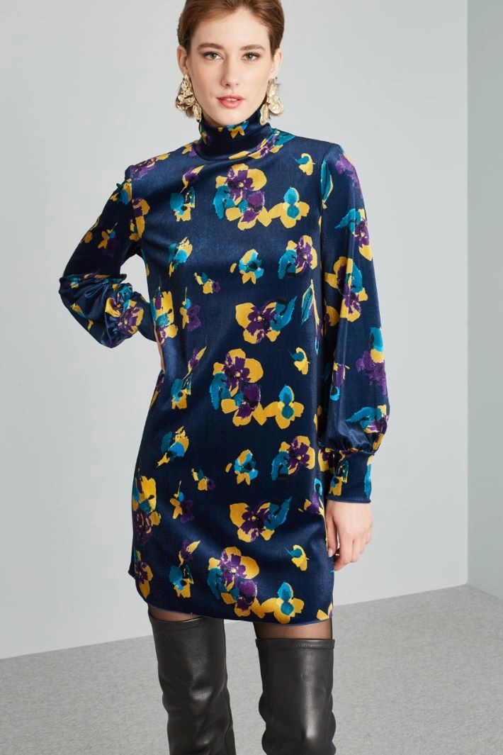 Short straight-fit dress in printed stretch velvet jersey, with high collar, long slightly puffed sleeves and cuff at the hem. Invisible zip fastening on the back.