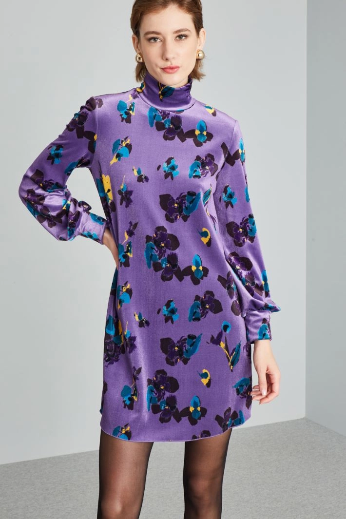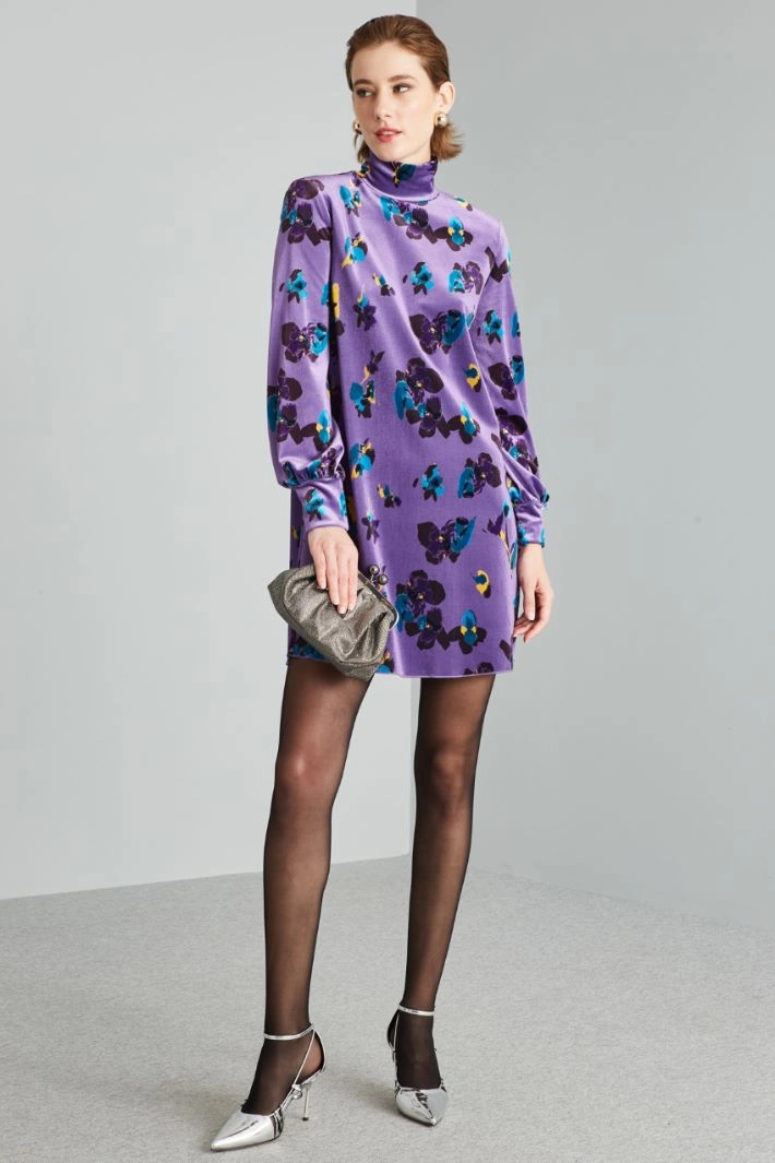 Short straight-fit dress in printed stretch velvet jersey, with high collar, long slightly puffed sleeves and cuff at the hem. Invisible zip fastening on the back.