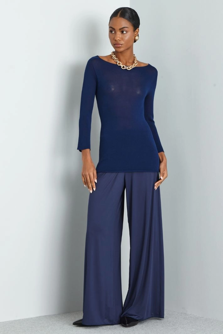 Wide, flowing trousers in stretch jersey, with elasticated waistband and French pockets.