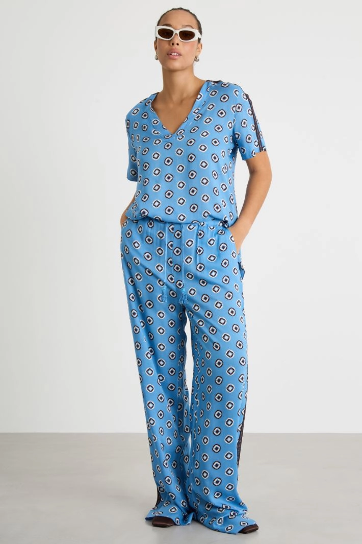 A loose-fit blouse crafted from printed flowing viscose, featuring a V-neck, short, crochet-trimmed sleeves and side slits at the hem.