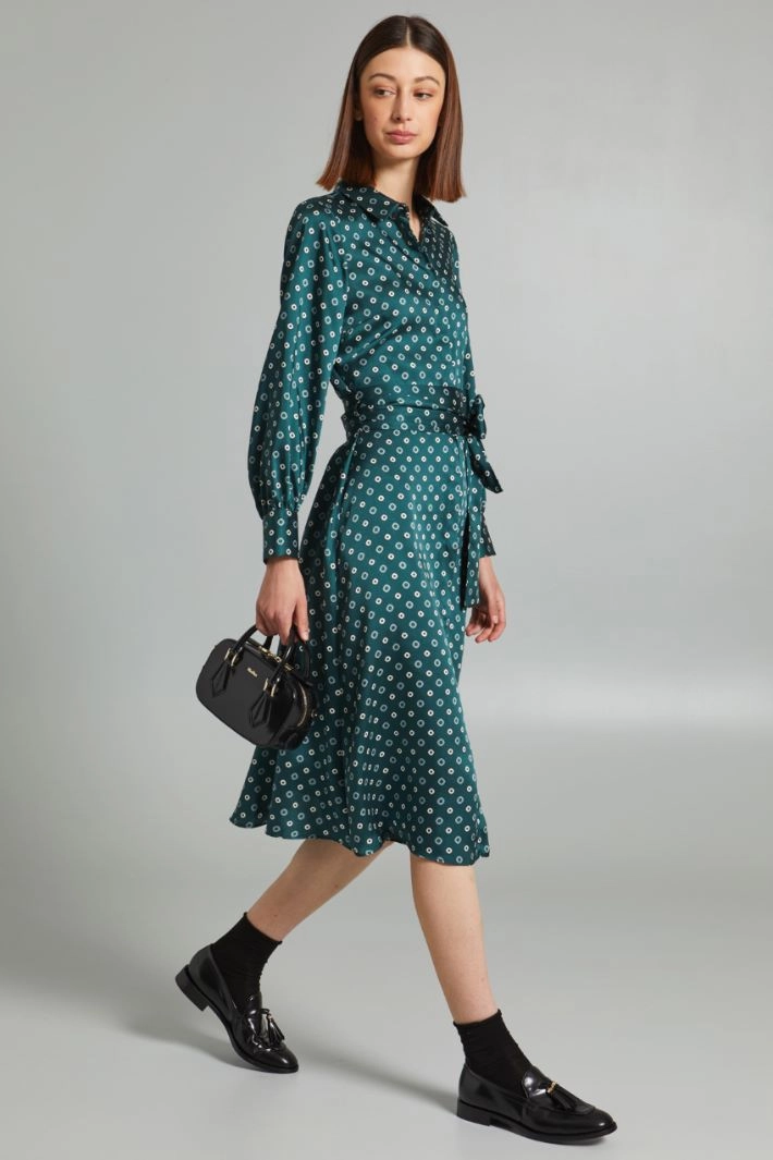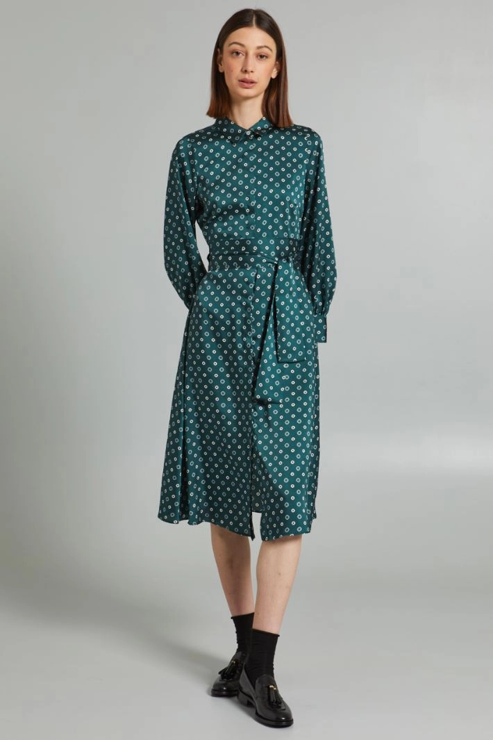 Fluid shirt dress in printed twill, with classic collar, long sleeves with cuff and buttons, cut at the waist and hidden button fastening. Matching belt.