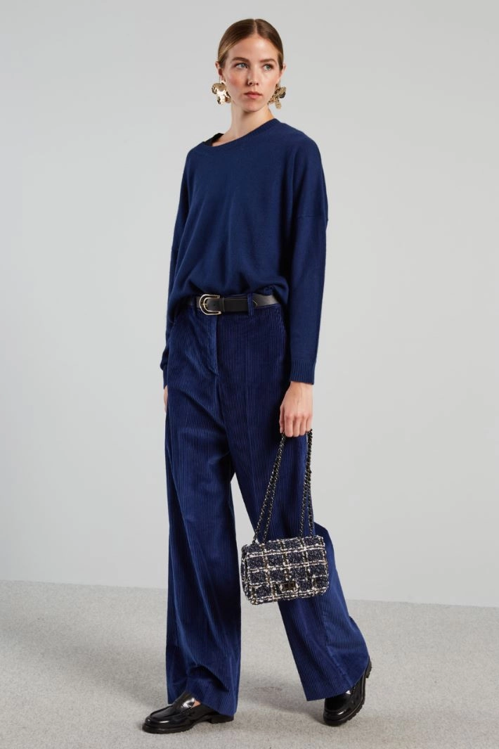 Loose fit sweater in cashmere blend wool yarn, with round neck and long sleeves.