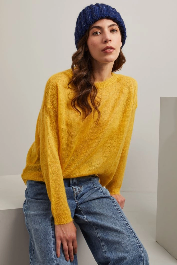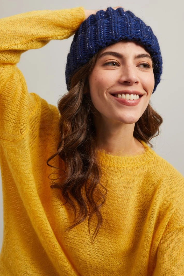 Beanie hat in wool, alpaca and viscose blend ribbed knit, with lurex yarn insert and turned-up bottom.