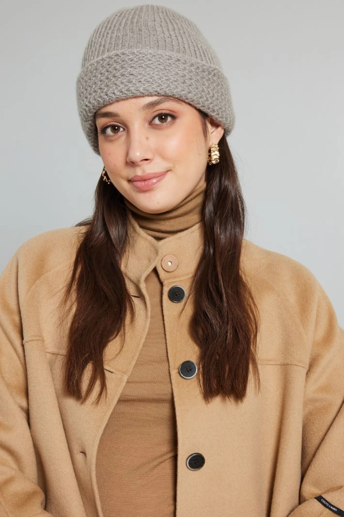 Beanie hat in mohair blend yarn with ribbing and turn-up at the bottom.